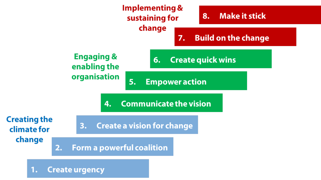 In 1996, John Kotter rocked the business world with his international bestseller, Leading Change. Considered by many to be the seminal work in the field of change management, his 8-step process (outlined below), gave meaning and order to what felt like pure chaos through any big corporate change (a merger, a turnaround, a new system, an enterprise-wide software change – anything that requires a massive change in behavior).